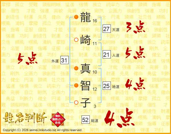 龍(16画)崎(11画) 真(10画)智(12画)子(3画)