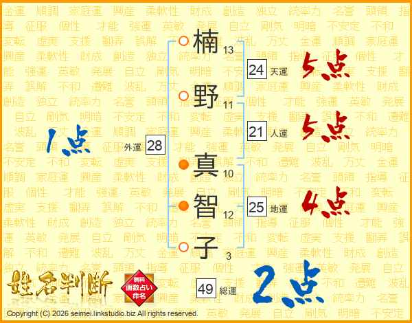楠(13画)野(11画) 真(10画)智(12画)子(3画)
