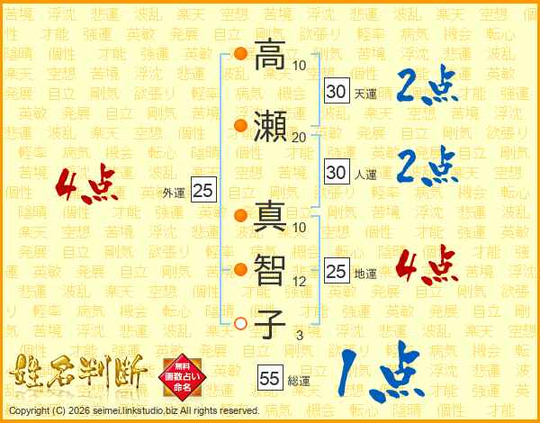 高(10画)瀬(20画) 真(10画)智(12画)子(3画)