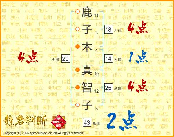 鹿(11画)子(3画)木(4画) 真(10画)智(12画)子(3画)