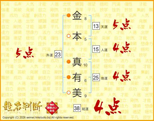 金(8画)本(5画) 真(10画)有(6画)美(9画)
