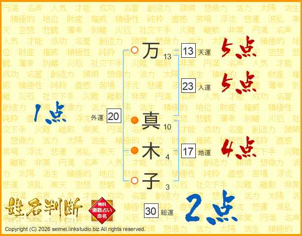 万(13画) 真(10画)木(4画)子(3画)