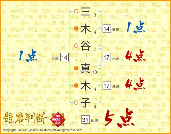 三(3画)木(4画)谷(7画) 真(10画)木(4画)子(3画)