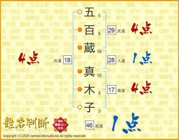 五(5画)百(6画)蔵(18画) 真(10画)木(4画)子(3画)