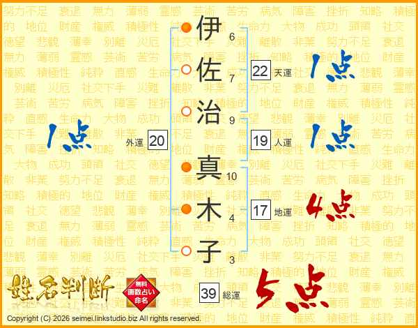 伊(6画)佐(7画)治(9画) 真(10画)木(4画)子(3画)