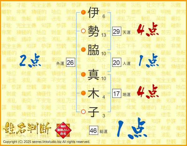 伊(6画)勢(13画)脇(10画) 真(10画)木(4画)子(3画)