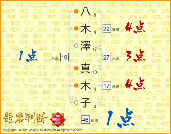 八(8画)木(4画)澤(17画) 真(10画)木(4画)子(3画)