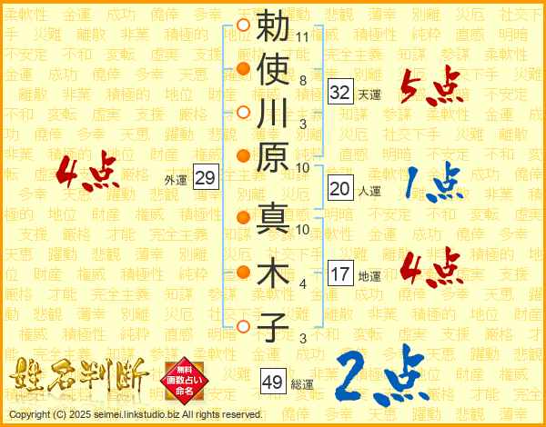 勅(11画)使(8画)川(3画)原(10画) 真(10画)木(4画)子(3画)