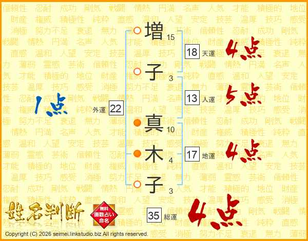 増(15画)子(3画) 真(10画)木(4画)子(3画)