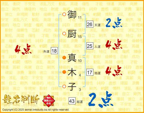 御(11画)厨(15画) 真(10画)木(4画)子(3画)