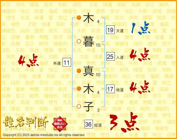 木(4画)暮(15画) 真(10画)木(4画)子(3画)