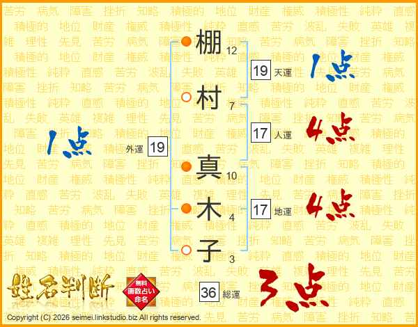 棚(12画)村(7画) 真(10画)木(4画)子(3画)