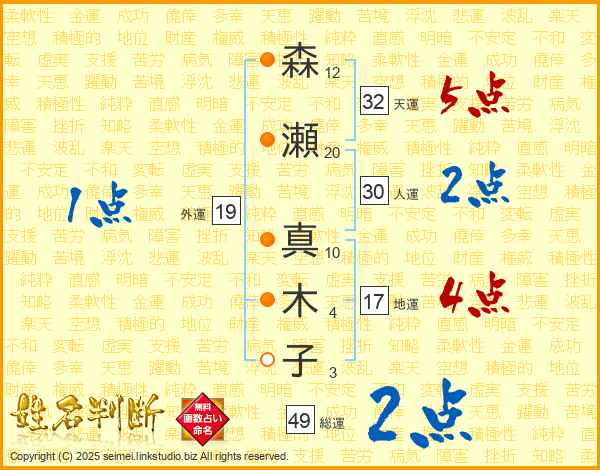 森(12画)瀬(20画) 真(10画)木(4画)子(3画)