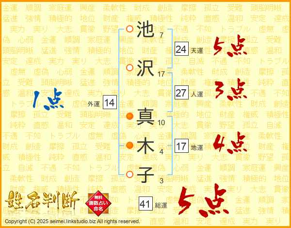 池(7画)沢(17画) 真(10画)木(4画)子(3画)