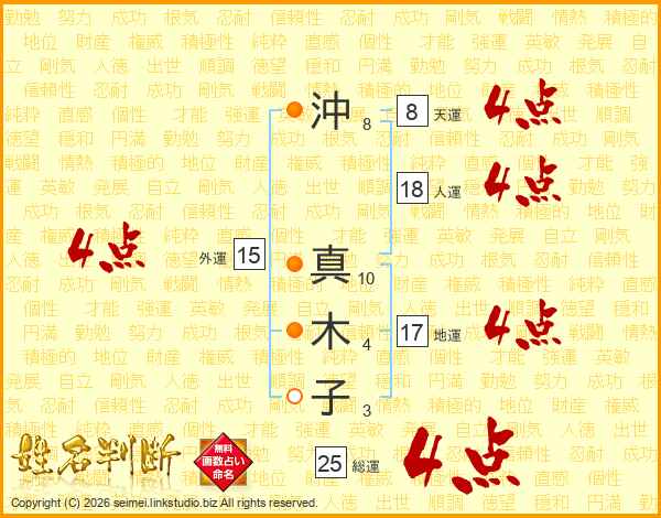 生活面を象徴する運勢です。外部から受ける影響力を表し、結婚運、家庭運や職場、環境への順応性を表します。総運から人運を引いた画数。姓や名が1文字の場合を除く。