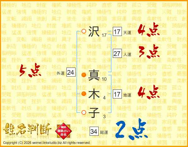 あなたの人生を表す1番重要な運勢です。生涯を通じて影響する総合運となり、主に50歳以降の晩年期に影響を及ぼします。苗字と名前の合計画数。