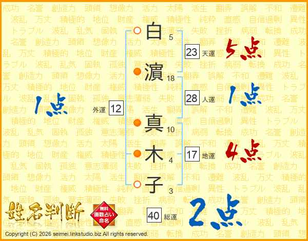 白(5画)濵(18画) 真(10画)木(4画)子(3画)