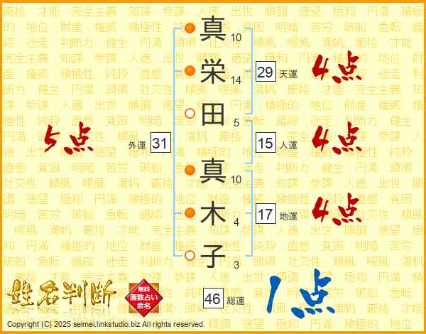 真(10画)栄(14画)田(5画) 真(10画)木(4画)子(3画)