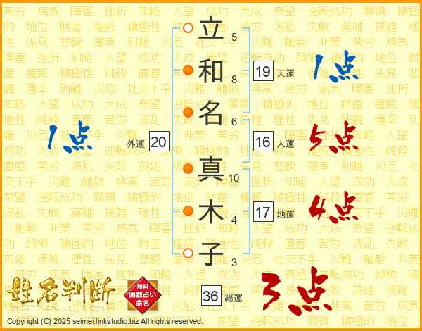 立(5画)和(8画)名(6画) 真(10画)木(4画)子(3画)