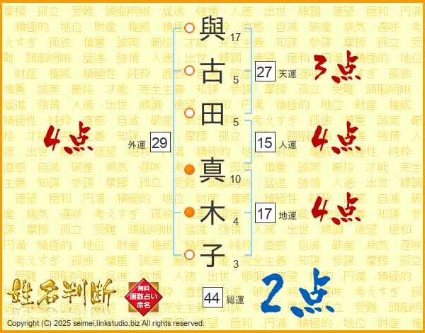 與(17画)古(5画)田(5画) 真(10画)木(4画)子(3画)