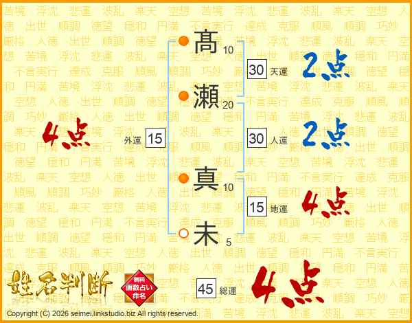 髙(10画)瀬(20画) 真(10画)未(5画)