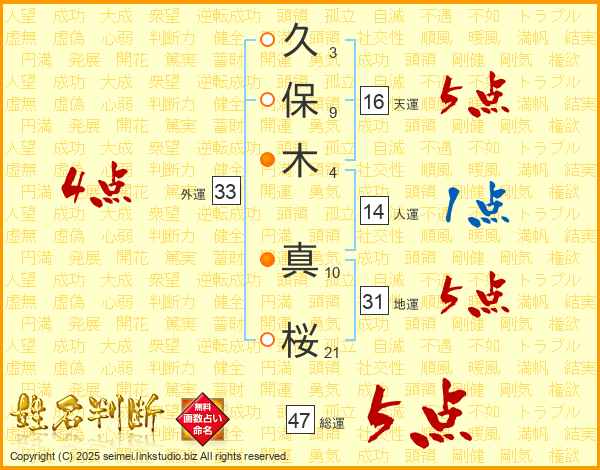 久(3画)保(9画)木(4画) 真(10画)桜(21画)