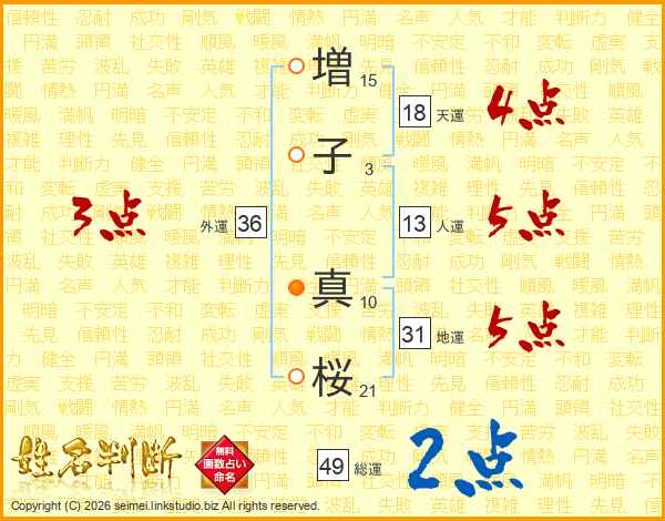 あなたの人生を表す1番重要な運勢です。生涯を通じて影響する総合運となり、主に50歳以降の晩年期に影響を及ぼします。苗字と名前の合計画数。