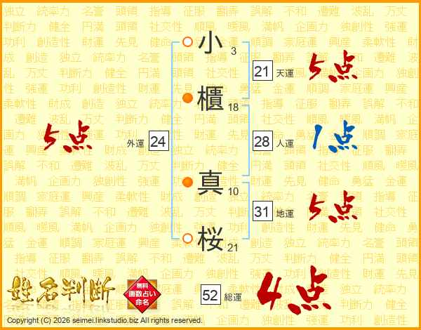 小櫃真桜さんの総運は52画の4点!