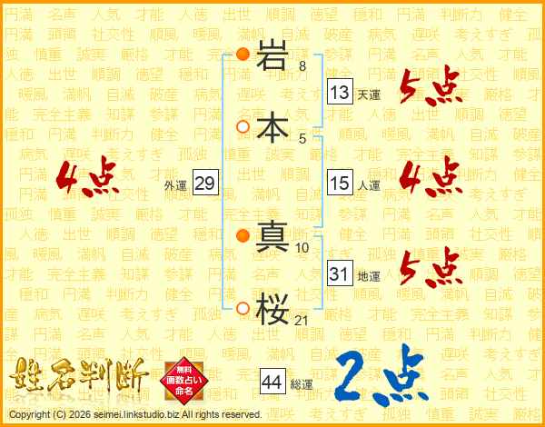 あなたの人生を表す1番重要な運勢です。生涯を通じて影響する総合運となり、主に50歳以降の晩年期に影響を及ぼします。苗字と名前の合計画数。