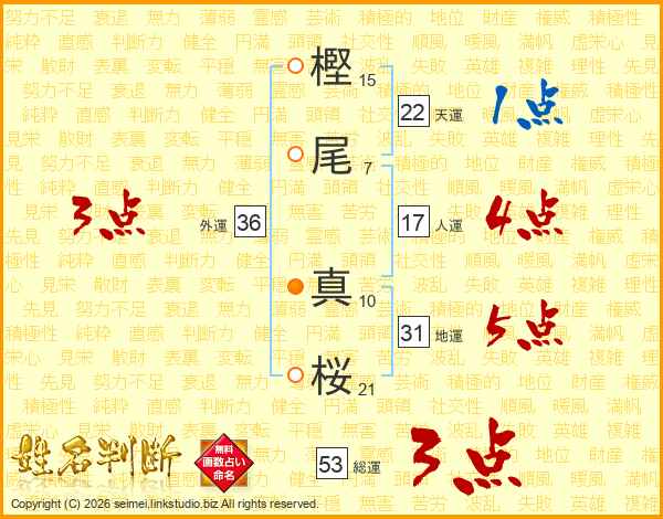 樫(15画)尾(7画) 真(10画)桜(21画)