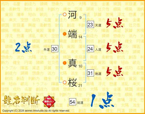 生活面を象徴する運勢です。外部から受ける影響力を表し、結婚運、家庭運や職場、環境への順応性を表します。総運から人運を引いた画数。姓や名が1文字の場合を除く。