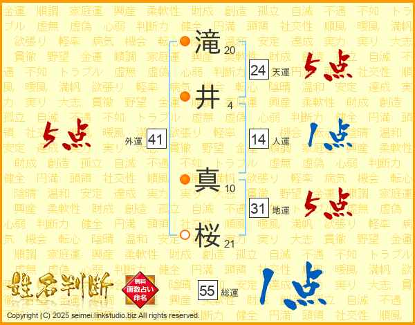 あなたの人生を表す1番重要な運勢です。生涯を通じて影響する総合運となり、主に50歳以降の晩年期に影響を及ぼします。苗字と名前の合計画数。