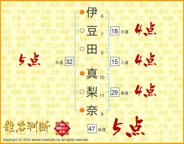 伊(6画)豆(7画)田(5画) 真(10画)梨(11画)奈(8画)