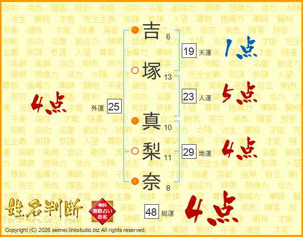 吉(6画)塚(13画) 真(10画)梨(11画)奈(8画)