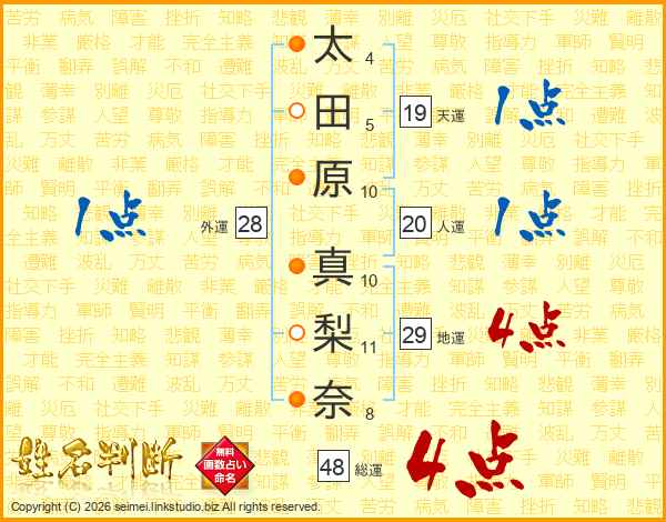 太(4画)田(5画)原(10画) 真(10画)梨(11画)奈(8画)