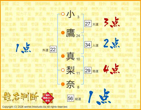 小(3画)鷹(24画) 真(10画)梨(11画)奈(8画)