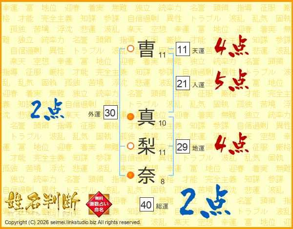 曺(11画) 真(10画)梨(11画)奈(8画)