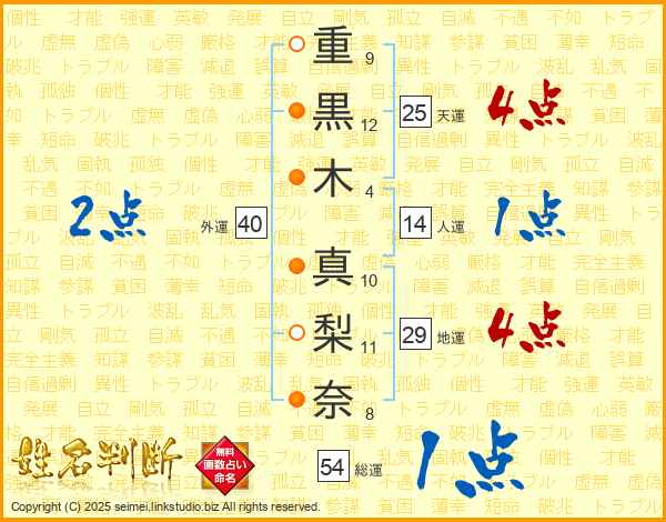 重(9画)黒(12画)木(4画) 真(10画)梨(11画)奈(8画)