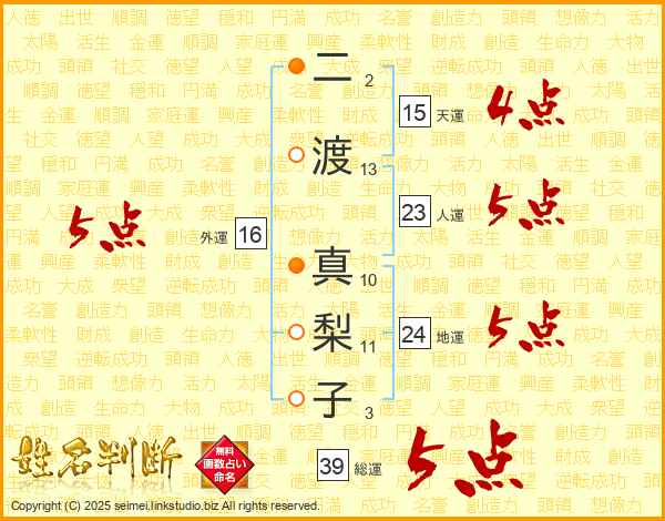 二(2画)渡(13画) 真(10画)梨(11画)子(3画)