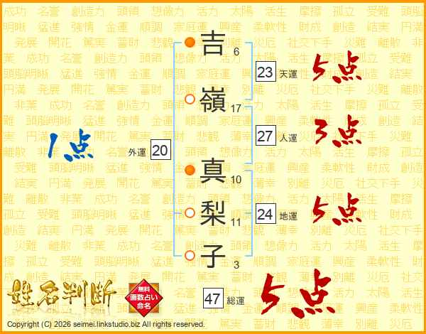 吉(6画)嶺(17画) 真(10画)梨(11画)子(3画)