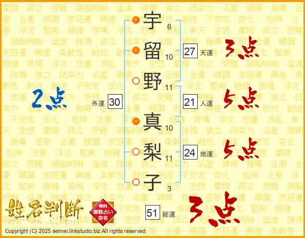 宇(6画)留(10画)野(11画) 真(10画)梨(11画)子(3画)