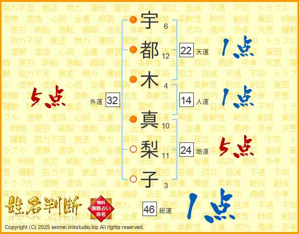 宇(6画)都(12画)木(4画) 真(10画)梨(11画)子(3画)