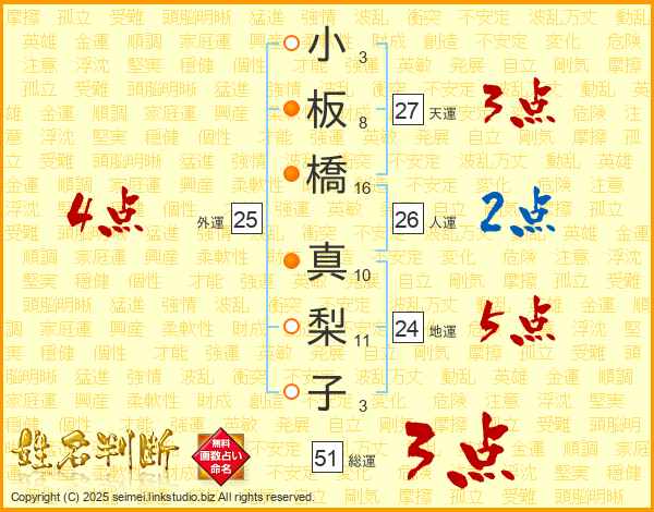 小(3画)板(8画)橋(16画) 真(10画)梨(11画)子(3画)