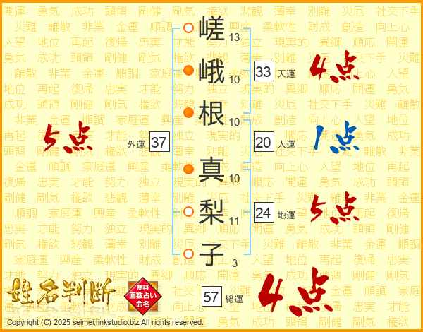 嵯(13画)峨(10画)根(10画) 真(10画)梨(11画)子(3画)