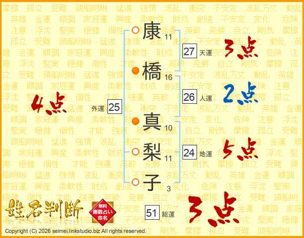 康(11画)橋(16画) 真(10画)梨(11画)子(3画)