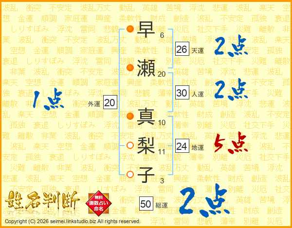 早(6画)瀬(20画) 真(10画)梨(11画)子(3画)