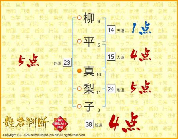 柳(9画)平(5画) 真(10画)梨(11画)子(3画)