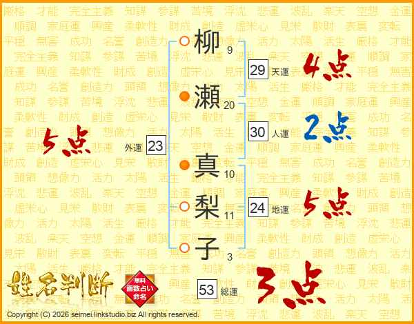 柳(9画)瀬(20画) 真(10画)梨(11画)子(3画)