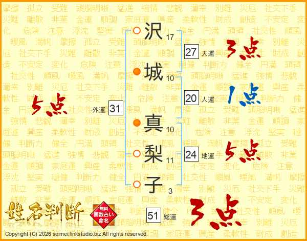 沢(17画)城(10画) 真(10画)梨(11画)子(3画)