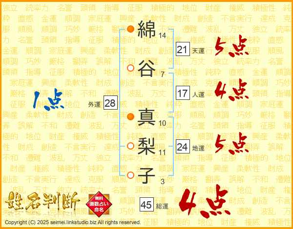 綿谷真梨子さんの総運は45画の4点!